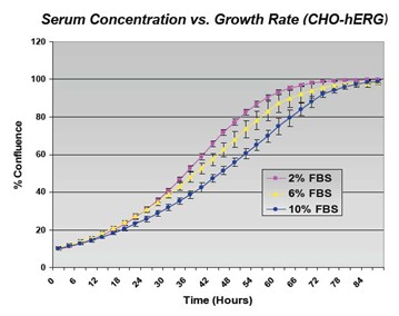 不同血清濃度培養基中CHO-hERG細胞的增殖曲線(xiàn),單層飽和度VS.時(shí)間圖表,細胞在2%血清的培養基中的生長(cháng)快于在10% 血清的培養基中的生長(cháng)